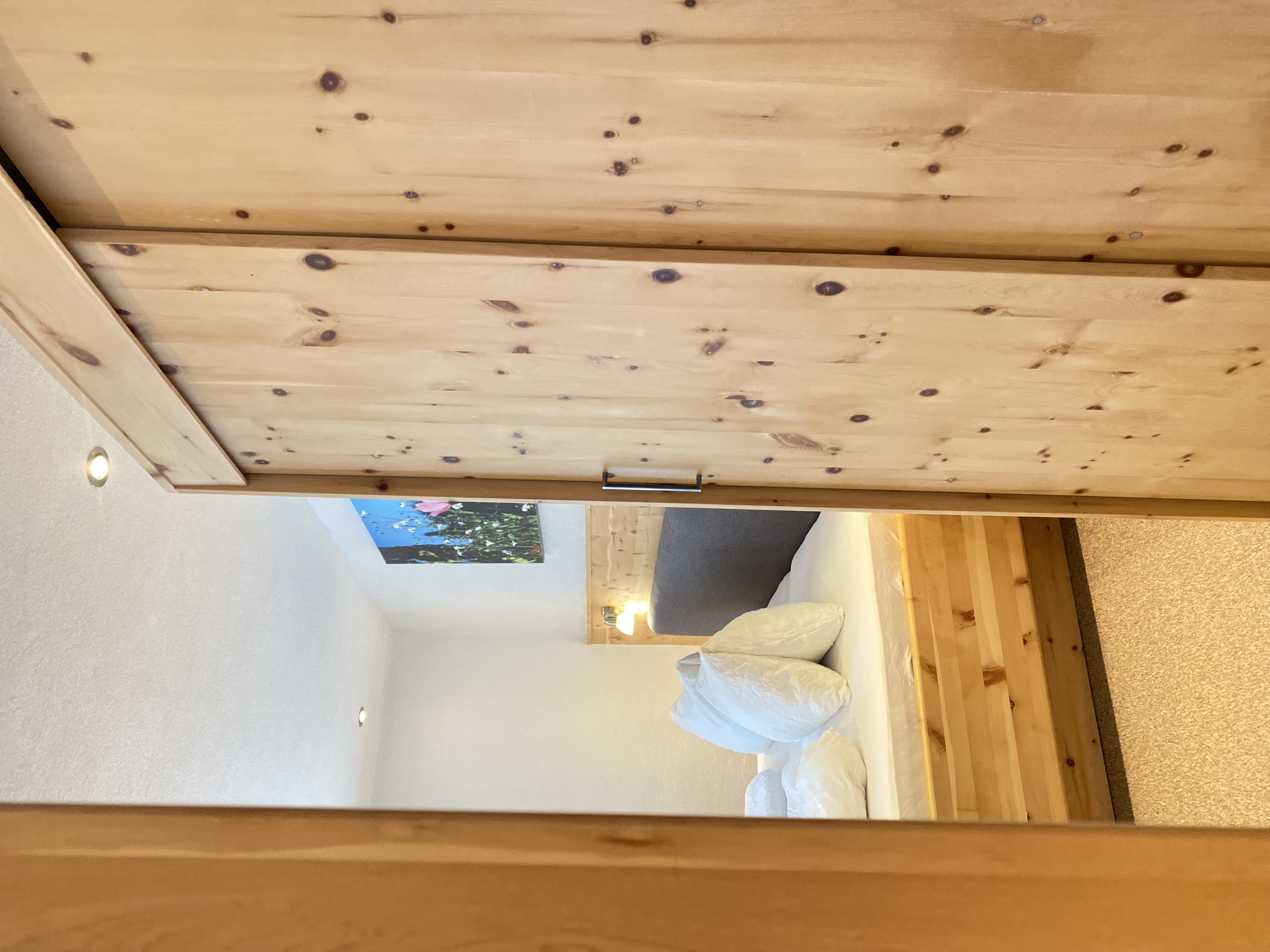 Doppelbett aus Zirbenholz, Teppichboden